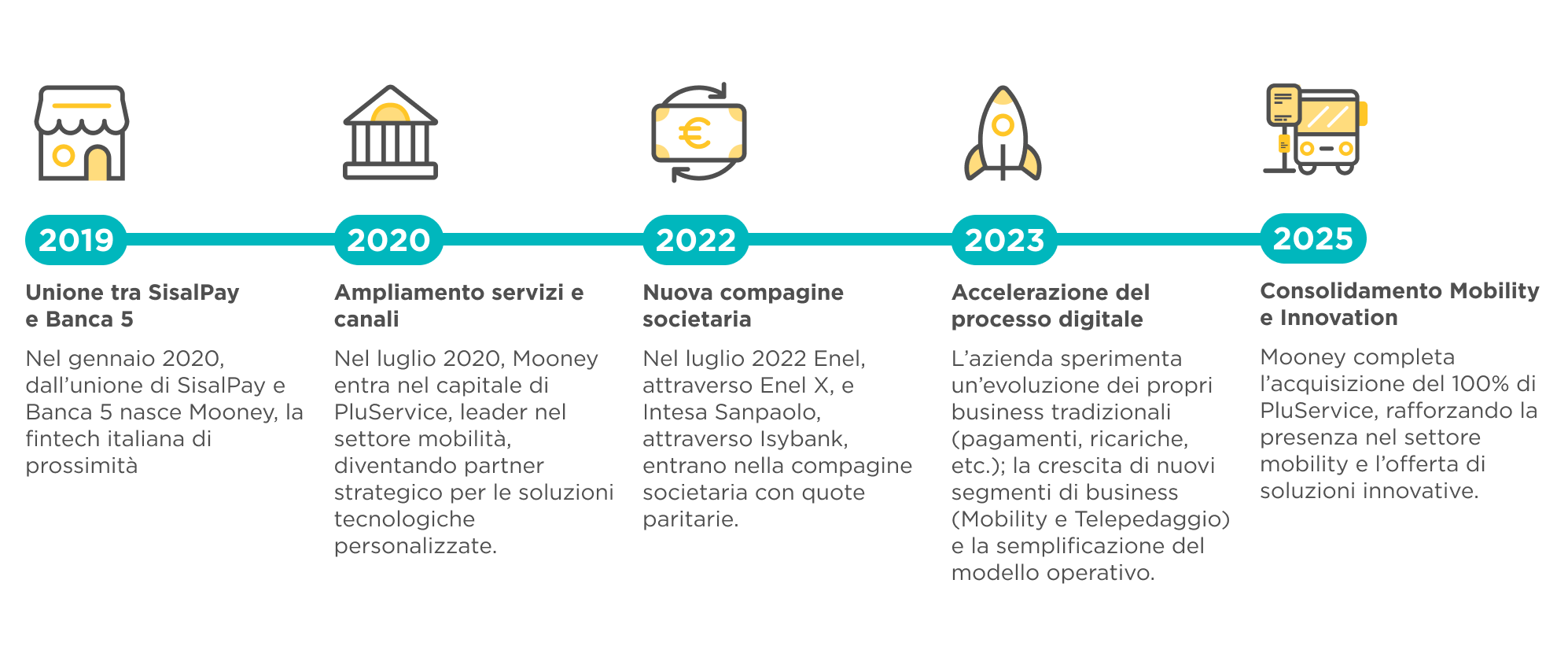 Nel 2020 dà avvio al processo di integrazione di Pluservice e myCicero nel gruppo Mooney per lo sviluppo dei pagamenti digitali nel settore della mobilità.