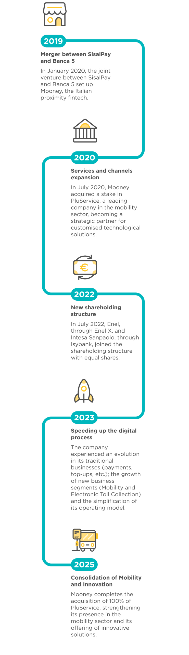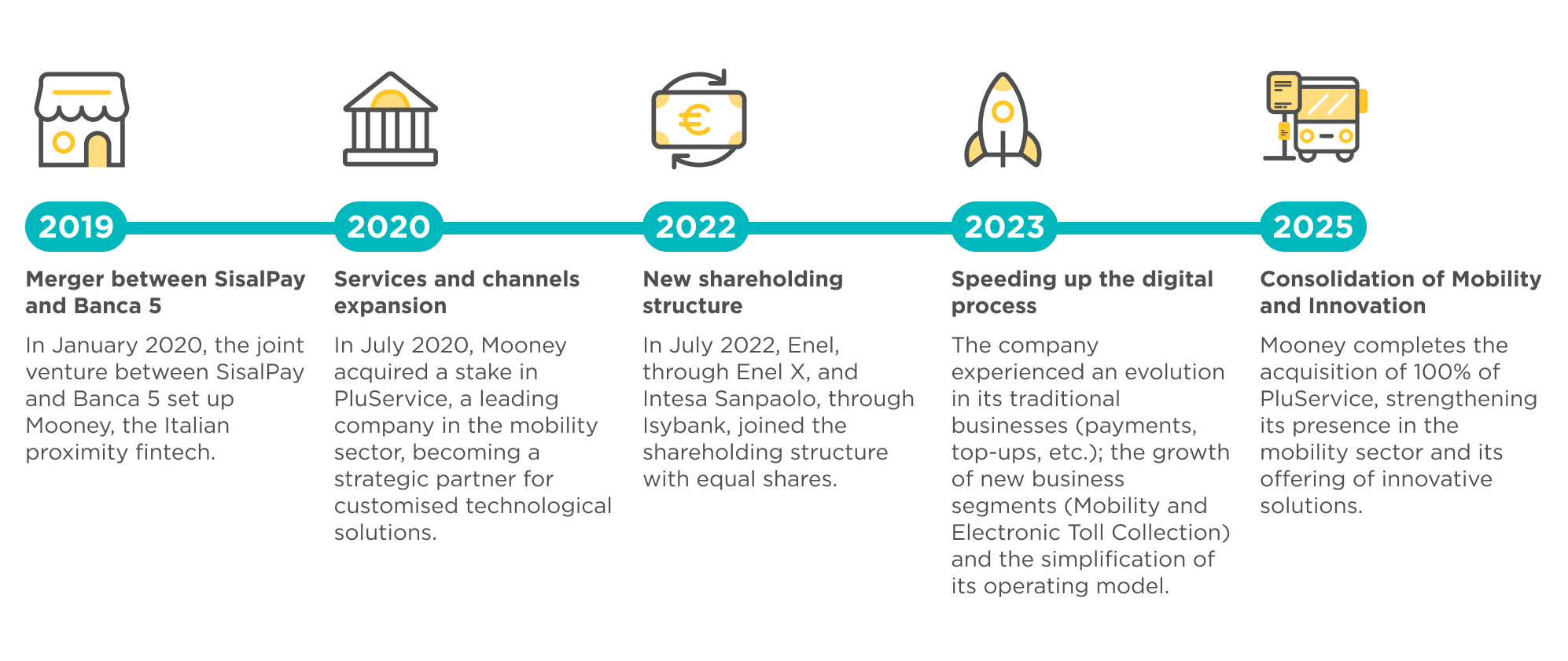 Nel 2020 dà avvio al processo di integrazione di Pluservice e myCicero nel gruppo Mooney per lo sviluppo dei pagamenti digitali nel settore della mobilità.