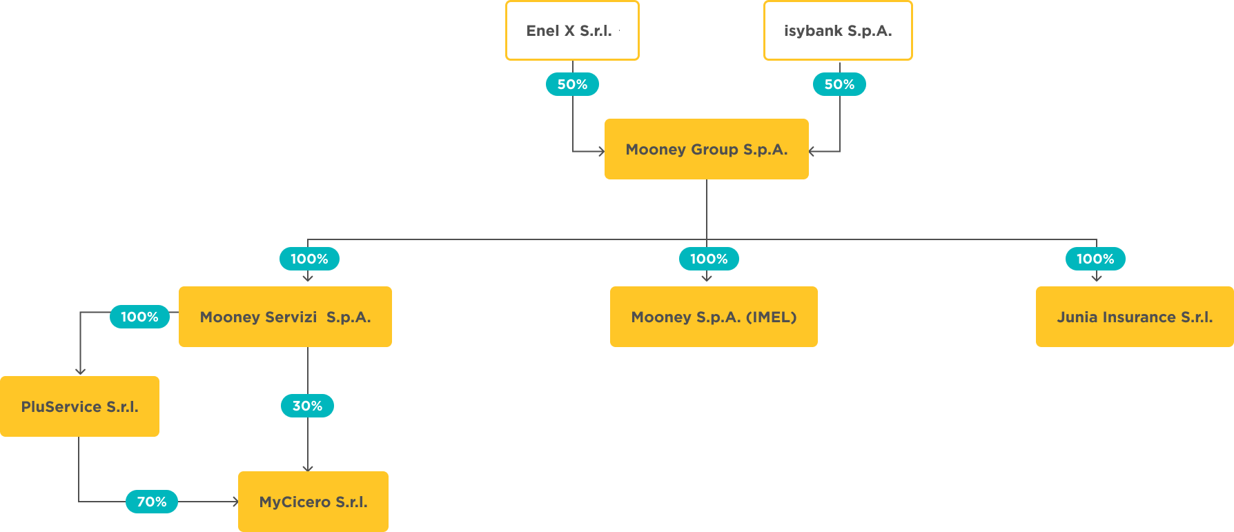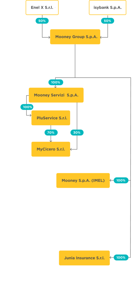 Mooney is the Italian fintech leader in proximity banking, payments and mobility services, and personalized technology solutions held by Enel and Intesa Sanpaolo, through Enel X and Isybank.
